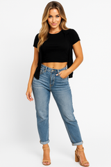 With a classic mid-rise waist and straight leg cut, they’re perfect for versatile styling—wear them with sneakers for a casual day out or dress them up with heels for a chic touch. The rolled hem design adds a trendy detail, making them a must-have for modern wardrobes.