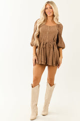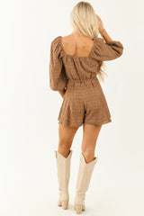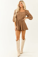 Chic Sepia Velvet Puff Sleeve Wide Leg Romper - Textured Fashion Jumpsuit for Effortless Style