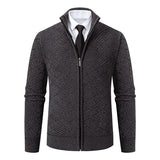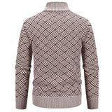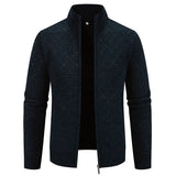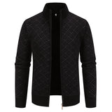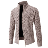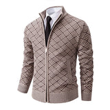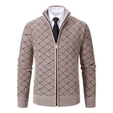 Unleash your inner style icon with this snazzy men's zip-up knit cardigan, featuring a head-turning geometric pattern. Its sleek full-front zipper makes layering a breeze over your favorite shirts or tees. The smart high collar not only adds a polished touch but also keeps you cozy when the temperatures drop. Crafted from comfortable polyester, this regular-fit cardigan is your perfect companion for autumn, winter, and early spring adventures.