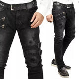 These men's biker pants with buckle detailing and a skinny fit are designed for those who crave a bold, edgy look. Made from durable denim, these ripped jeans feature stylish knee panels and buckle accents that add a punk-inspired flair. Perfect for pairing with your favorite graphic tees or leather jackets, these jeans are ideal for concerts, nights out, or casual gatherings. Make a statement and showcase your unique style with these standout pants.