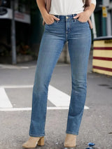 Women's Mid Waist Slim Fit Straight Leg Jeans - Elastic, Slanted Pockets, Machine Washable, Perfect for Everyday Wear