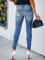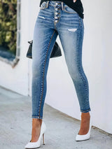 Women's High-Waisted Slim Fit Jeans - Elastic Perforated Design, Single Breasted, Washed Finish, Casual Style with Slanted Pockets