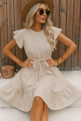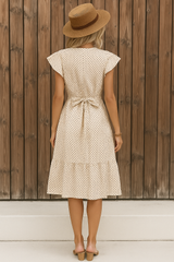 Elevate your everyday look with this charming polka dot dress. Designed with playful ruffled sleeves and a flattering belted waist, this dress exudes effortless style and comfort. The button-front detail adds a classic touch, while the flared skirt brings movement and grace to your stride. Perfect for sunny strolls or casual outings.