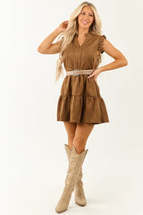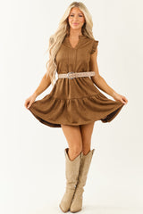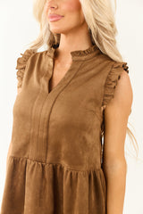 Chic Sepia Faux Suede Mini Dress with Frill Cuffs - Tent Style Fashion for Effortless Elegance