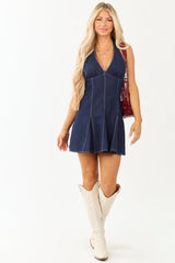 Dark Wash Denim Halter Neck Sleeveless Mini Dress for Women - Trendy Summer Casual Outfit