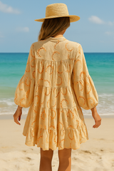 Effortlessly chic and perfect for warm-weather days, this embroidered beige mini dress blends boho elegance with a tropical twist. Featuring subtle orange-toned embroidery, a relaxed tiered silhouette, and breezy flared sleeves, it offers comfort and charm whether you're lounging beachside or strolling through a summer market. Ideal for vacation getaways or laid-back weekends.