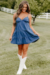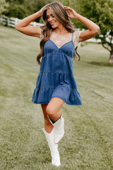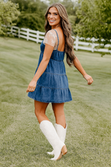 Tiered Denim Mini Dress with Lace Top & Western Boots