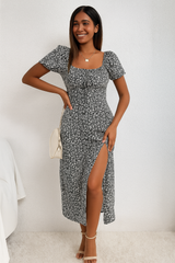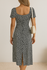 Charming and feminine, this black floral midi dress is a perfect balance of elegance and flirtiness. Featuring delicate white daisy prints throughout, it’s designed with a square neckline, flattering puff sleeves, and a fitted silhouette that enhances your shape. The thigh-high slit adds a touch of allure, while the smocked back ensures comfort and flexibility. Whether styled casually with sandals or elevated with heels and a handbag, this dress is ideal for brunches, garden parties, or romantic evenings.