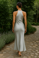 Effortlessly elegant, this satin halter maxi dress brings timeless glamour to any setting. Crafted in a silky smooth silver satin fabric, it features a high neckline that flatters the shoulders and a softly flowing silhouette that enhances the natural curves. The floor-length design adds a refined touch, while the subtle sheen of the material catches the light beautifully. Perfect for summer evenings, destination dinners, or special occasions where understated luxury is key.