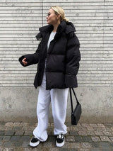 This women’s oversized puffer jacket offers a relaxed, street-ready fit with a high collar winter coat design for maximum wind protection. The quilted puffer jacket ensures excellent insulation while providing a contemporary oversized silhouette perfect for layering. Ideal for casual days, city outings, or travel, it blends modern style with cold-weather functionality.