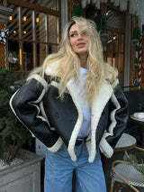 This women’s short winter jacket features an oversized silhouette with a standout contrast trim for a striking, modern look. The warm winter coat design includes a wide collar and relaxed fit, making it perfect for layering over everyday outfits. Ideal for adding both comfort and style to your cold-weather wardrobe.