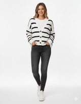 This women's soft knit cardigan features clean stripes and a relaxed silhouette for a timeless yet modern look. With a classic button front cardigan sweater closure and cozy fit, it’s perfect for everyday casual wear or layering over your favorite basics. A must-have women's casual knit sweater that adds style and comfort to any outfit.
