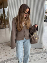 Classic Structure with a Soft, Feminine V-Neck Cardigan Look