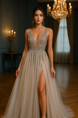 This exquisite evening gown is a true showstopper, designed for special occasions that call for timeless elegance and glamour. Crafted with layers of delicate tulle, it features a deep V-neckline and sheer bodice richly adorned with shimmering crystal embellishments. The fitted waist flows into a voluminous skirt with a dramatic front slit, adding movement and allure to your every step. Ideal for galas, red carpet events, or formal weddings, this dress combines ethereal beauty with modern sophistication.