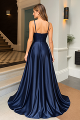 This stunning navy blue evening gown embodies timeless elegance and modern sophistication. Crafted from luxurious satin with a subtle sheen, the dress features a structured square neckline, delicate spaghetti straps, and a beautifully tailored bodice that flows into a full A-line skirt. Perfect for galas, formal events, or weddings, this gown exudes grace, movement, and confidence with every step.