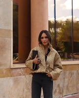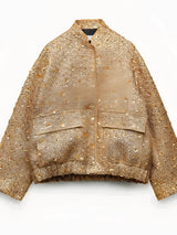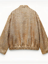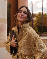 The Textured Gold Metallic Bomber Jacket is a chic piece of women's outerwear that combines style and comfort effortlessly. This jacket is available in a stunning gold color and comes in a range of sizes from S to XL, ensuring a perfect fit for everyone. Designed with beautiful sequins, it creates a luminous effect that is both glamorous and eye-catching, making it an ideal choice for both casual and elegant occasions. The Loretta jacket is crafted from high-quality fabric, offering a unique cut that is sure to earn you compliments. Its design is not only beautiful and feminine but also elegant, making it a versatile addition to your wardrobe. Whether you're looking for something to wear during the holidays or a piece that can transition through all seasons, this jacket is perfect. The glitter and shine add a touch of everyday luxury, while the comfortable fit ensures it feels pleasant against the skin. Additionally, the jacket comes with the added benefit of free shipping, making it an even more attractive purchase. Embrace the allure of this metallic bomber jacket and let it become a staple in your collection, offering both style and practicality.
