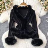 Wrap yourself in cozy elegance with this stunning ribbed knit top, featuring plush faux fur trim on the neckline, hem, and cuffs for a touch of glam. Its unique texture contrast creates a striking silhouette, perfect for making a statement at any evening event. The flattering V-front design and long sleeves keep you chic and comfortable through autumn and winter. Effortlessly elevate your wardrobe with this versatile, button-front piece that transitions seamlessly from casual chic to sophisticated layers.