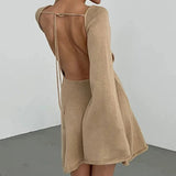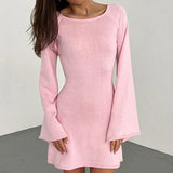 This chic mini dress features a wide neckline that perfectly frames your collarbone for an elegant yet effortless look. The long sleeves end in dramatic flared cuffs, adding a touch of playful movement to your every gesture. Crafted with a smooth finish and a streamlined silhouette, it is the ideal choice for transitioning from daytime charm to evening flair. Its short hemline keeps things fun and flirty while maintaining a sophisticated edge.