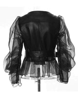 Women's Faux Leather Jacket with Sheer Ruffled Sleeves, Belted Waist & Front Zip Closure - Stylish & Trendy Outerwear