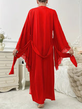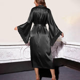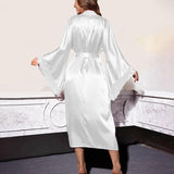 Wrap yourself in pure elegance with this floor-sweeping kimono gown featuring delicate lace trim and breezy wide sleeves. The matching waist tie lets you cinch your silhouette for a perfectly flattering look while lounging at home. Its silky-smooth fabric feels like a gentle hug against your skin, making every evening feel like a spa retreat. This full-length robe combines classic charm with a touch of romance for your most stylish downtime yet.