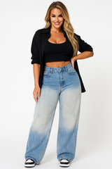 Bring bold energy and relaxed style to your everyday wardrobe with these Women’s Loose Fit Color Block Straight Jeans. Featuring a striking light blue gradient wash with a subtle color-blocked effect, these jeans are made for effortless cool. The wide-leg silhouette and casual loose fit offer maximum comfort and movement, while the high-rise waist gives a flattering shape that pairs perfectly with crop tops, oversized tees, or hoodies.